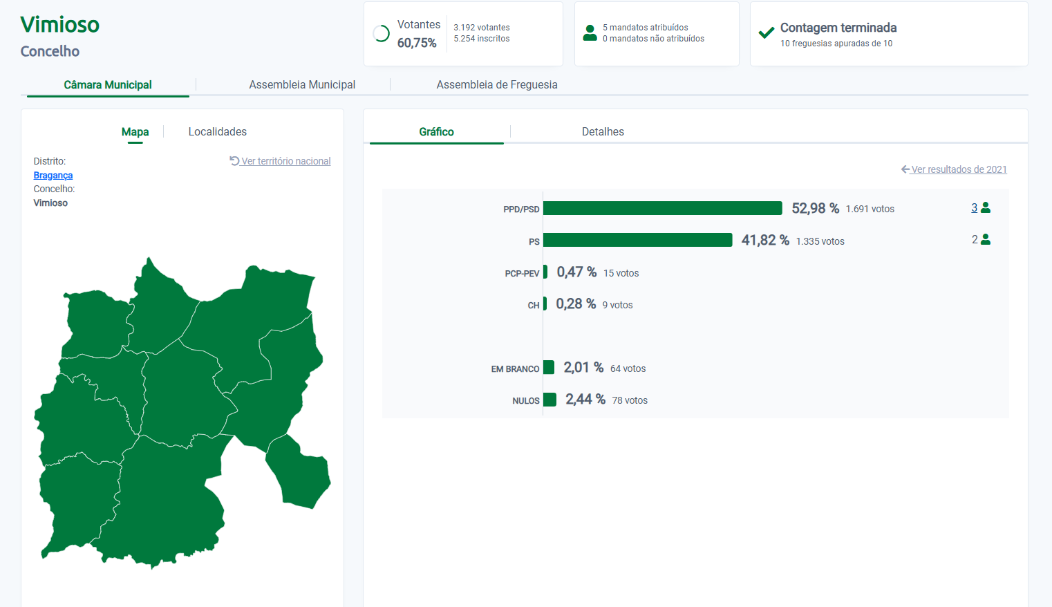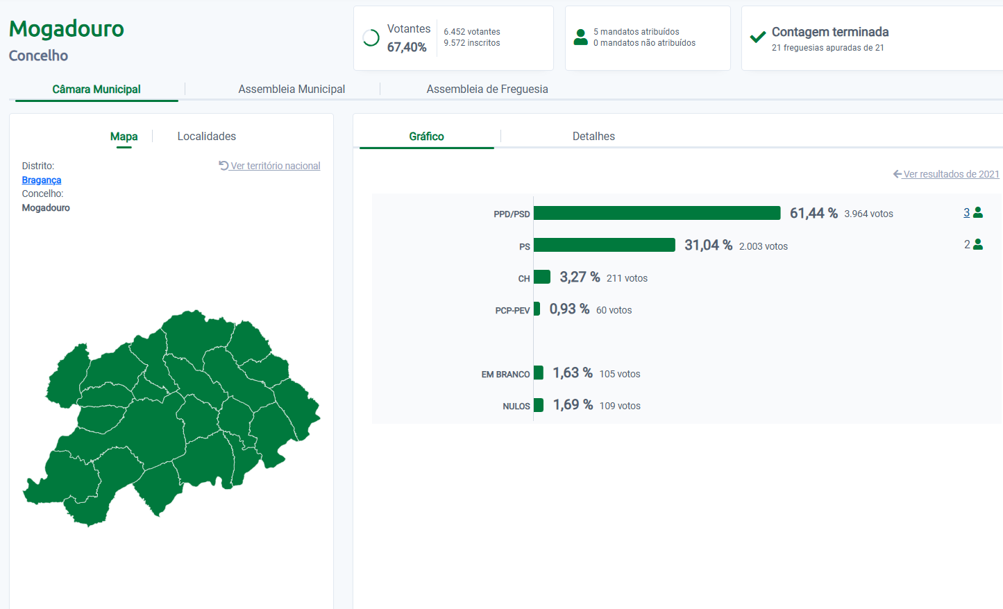 O PSD venceu as eleições autárquicas no distrito de Bragança, conquistando sete das 12 câmaras municipais, duas das quais em coligação com o CDS-PP, segundo dados da Secretaria Geral do Ministério da Administração Interna (SIGMAI).
