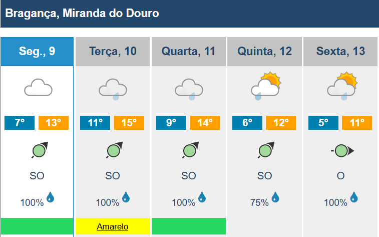 Todos os distritos de Portugal continental estão quarta e quinta-feira sob aviso amarelo devido à previsão de chuva por vezes forte, passando a aguaceiros, devido à passagem de uma nova depressão, segundo o IPMA.