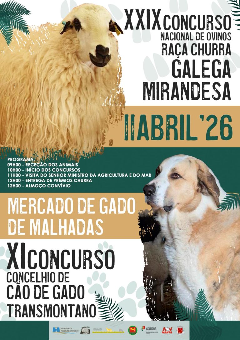 O Mercado de Gado, em Malhadas, acolhe no sábado, dia 11 de abril, o XXIX Concurso Nacional de Ovinos da Raça Churra Galega Mirandesa e o XI Concurso Concelhio de Cão de Gado Transmontano, um evento que tem por finalidade a preservação das raças autóctones e o apoio ao setor agropecuário.
