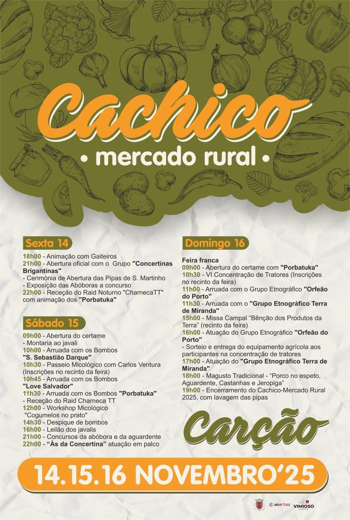 Com o propósito de promover e comercializar os produtos locais, no fim-de-semana de 14, 15 e 16 de novembro, a localidade de Carção, no concelho de Vimioso, organiza o já tradicional Cachico – Mercado Rural, um certame que nesta VII edição inclui atividades como uma montaria ao javali, um passeio micológico e a atuação do grupo etnográfico “Terra de Miranda”.