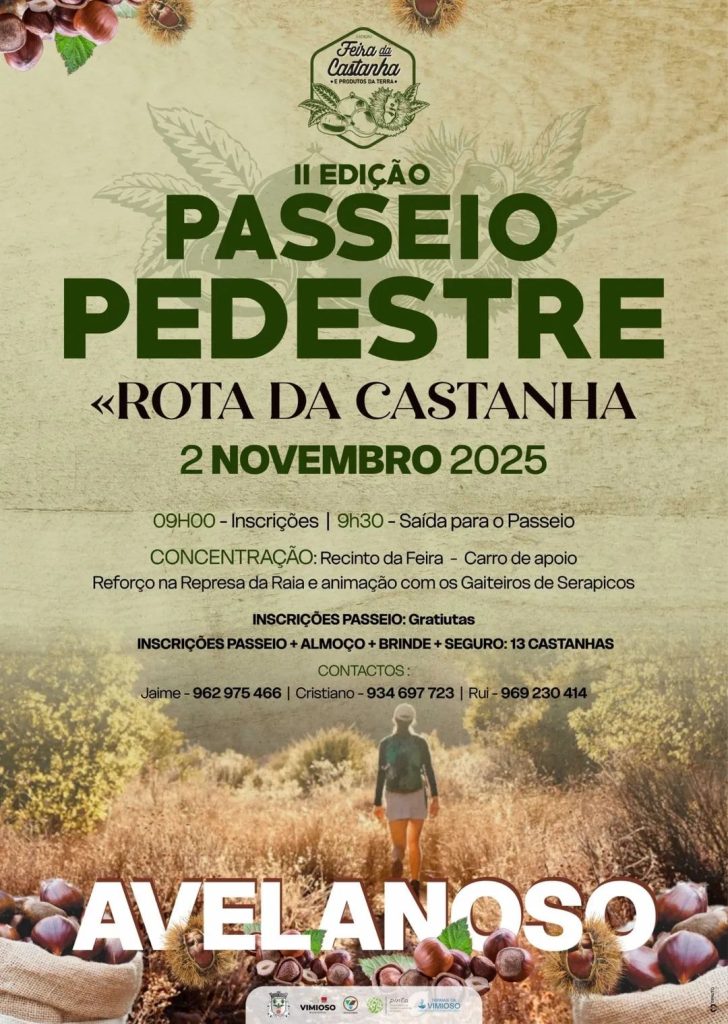 No Domingo, 2 de novembro, a jornada começa com o II Passeio pedestre “Rota da Castanha”, uma atividade que tem o duplo propósito de proporcionar a atividade física e dar a conhecer aos participantes o produto âncora de Avelanoso, a castanha, numa visita aos soutos de castanheiros existentes nesta localidade raiana.