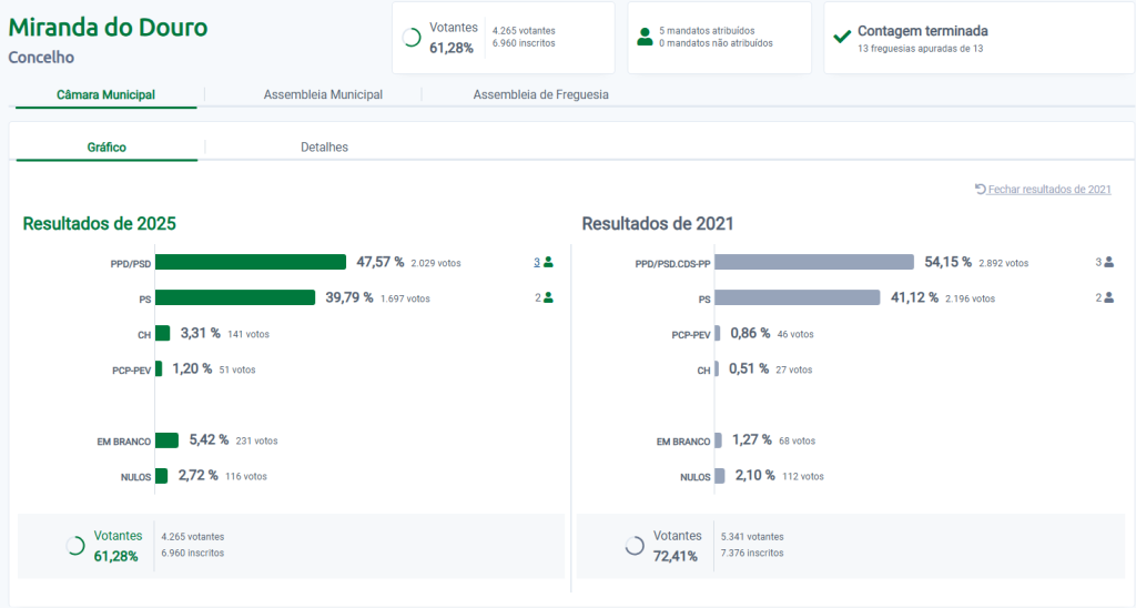 O PSD de Miranda do Douro justifica a diminuição na votação, com o significativo aumento da abstenção, dado que em 2021 votaram 5341 eleitores, enquanto que em 2025, votaram 4265 pessoas, ou seja menos 1076 votantes, segundo dados do Ministério da Administração Interna (SIGMAI).