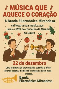 Para celebrar o Natal, no sábado dia 20 de dezembro, a Banda Filarmónica Mirandesa oferece um concerto na concatedral de Miranda do Douro e no dia 22, os músicos deslocam-se aos lares e instituições particulares de solidariedade social (IPSS’s) do concelho, para oferecer momentos de música e convívio às pessoas institucionalizadas.