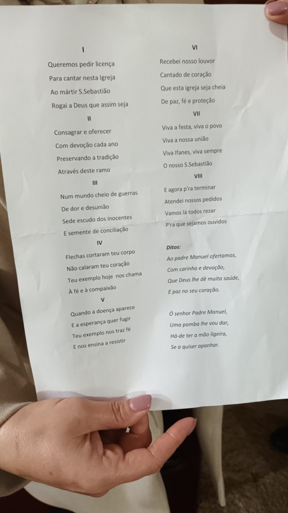 Este ano, a missa solene em honra de São Sebastião, celebrou-se ao início da tarde de sábado, dia 31 de janeiro, na igreja matriz. A celebração religiosa começou com a tradição do canto do ramo, entoado pelas mordomas da festa.