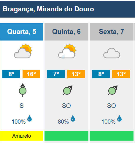 O distrito de Bragança vai estar com aviso amarelo por causa da chuva por vezes forte entre as 06:00 e as 15:00 de quarta-feira