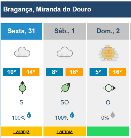 Os distritos de Bragança, Viseu, Porto, Guarda, Vila Real, Viana do Castelo, Aveiro, Coimbra e Braga são os distritos sob aviso laranja durante o dia de sexta-feira, porque se prevê “precipitação persistente e por vezes forte”, segundo o IPMA, que anteriormente tinha informado que estes territórios estariam sob aviso amarelo (o menos grave de uma escala de três).