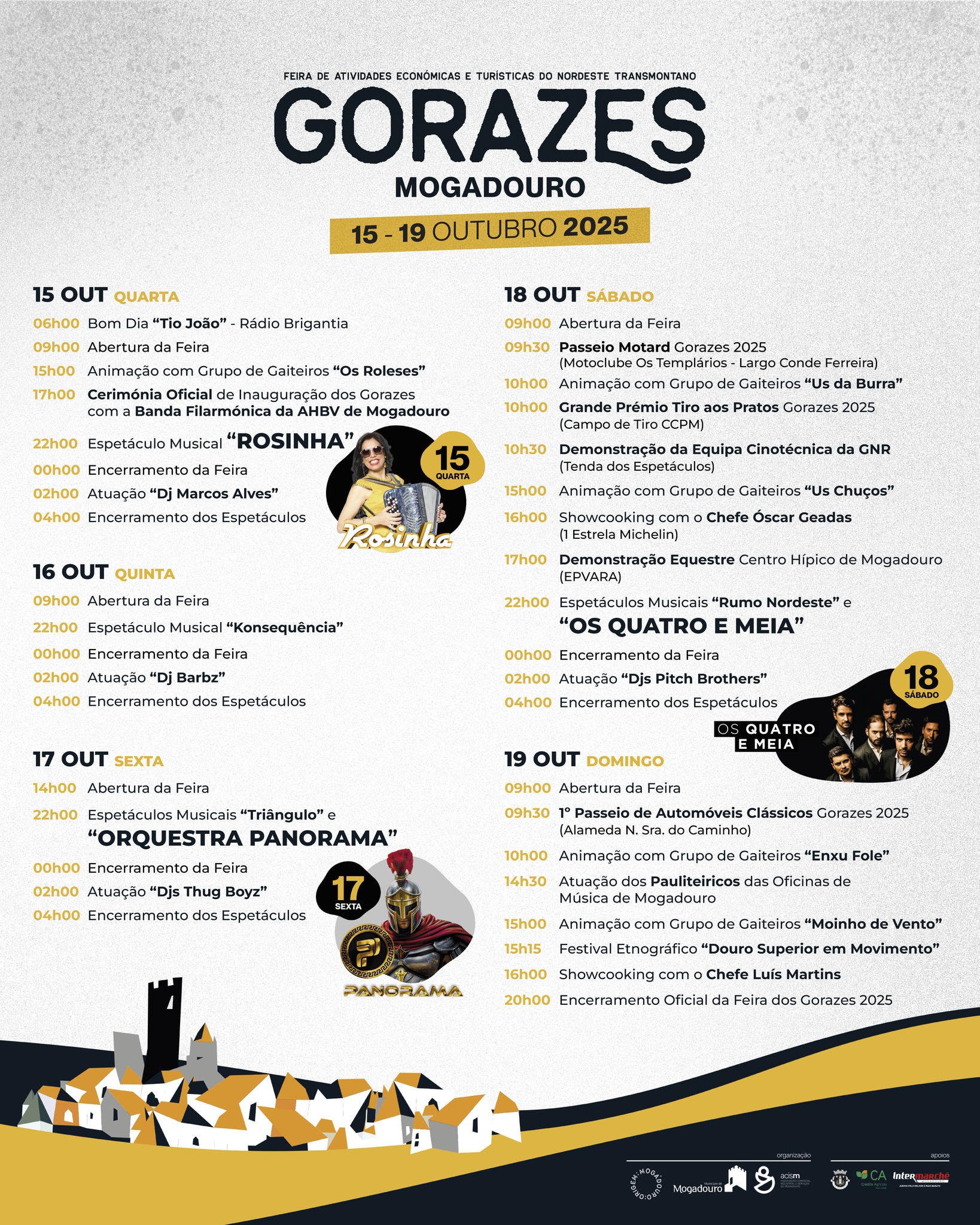 «Na programação musical, todos os anos procuramos selecionar grupos e artistas com estilos diversificados de modo a ir ao encontro das preferências de vários públicos. Este ano, no dia 15 de outubro, a artista “Rosinha”, vai animar a abertura dos Gorazes. Depois, na sexta-feira, dia 17, atua a orquestra espanhola “Panorama”. E no sábado, dia 18 de outubro, está programado o concerto do grupo português “Os Quatro e Meia”. Importa ainda referir, que a animação do certame ao longo dos cinco dias conta também com a participação de grupos locais, como a Banda Filarmónica, os gaiteiros, mascarados, Dj’s, entre outros», indicou.