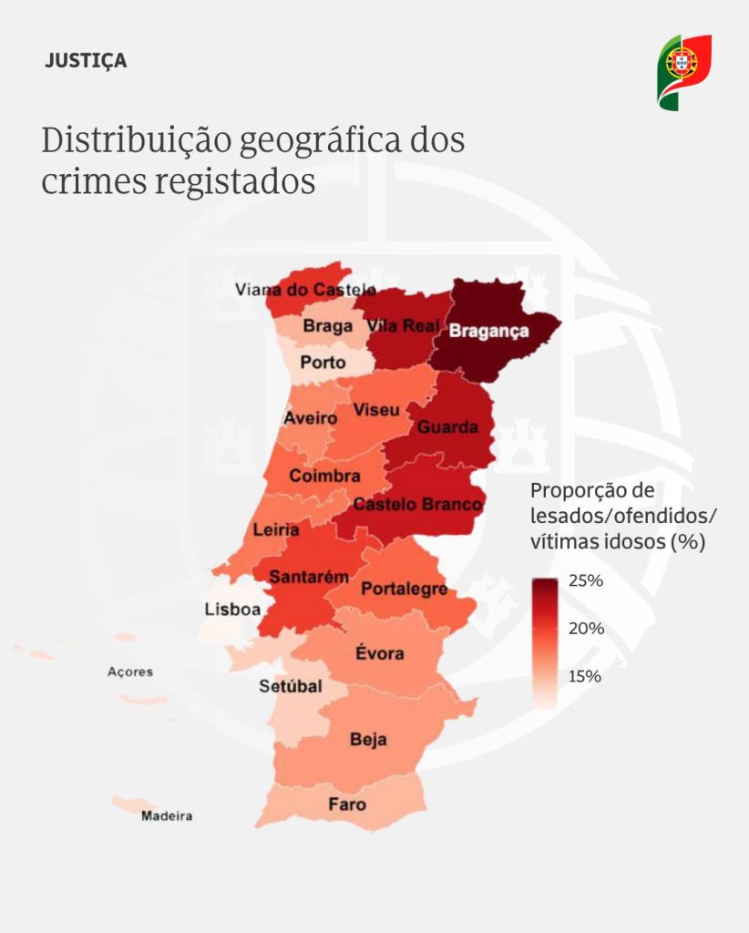 A DGPJ avança ainda que os distritos do interior norte e centro do país registam as maiores proporções de crimes contra pessoas idosas, sendo Bragança o que apresenta o valor mais elevado com 25,18%, seguido Vila Real (22,99%), Guarda (22,72%), Castelo Branco (21,83%), Viana do Castelo (20,57%), Santarém (19,98%), Portalegre (18,47%), Viseu (18,40%), Coimbra (18,36%).